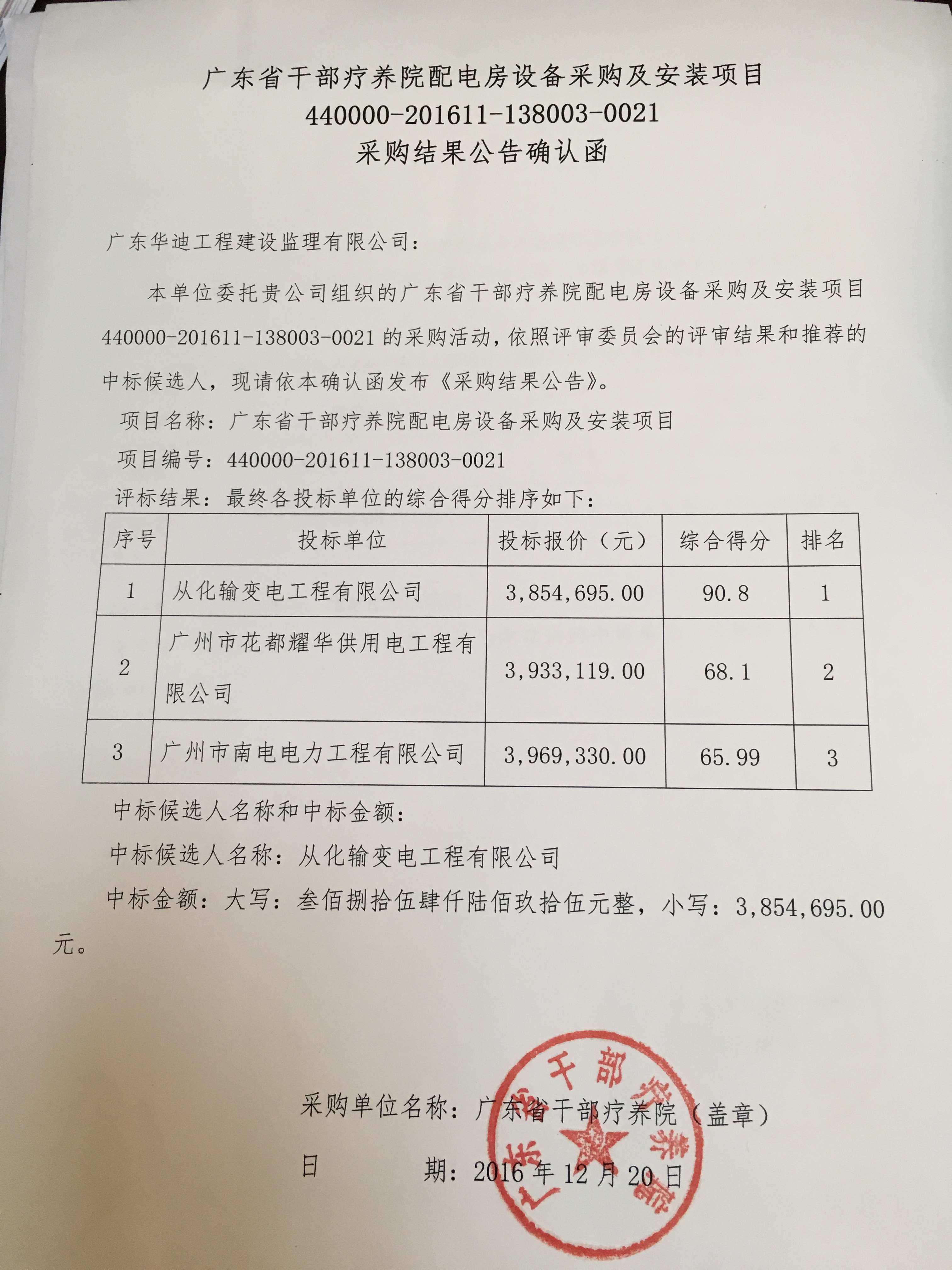 廣東省干部療養(yǎng)院配電房設(shè)備采購(gòu)及安裝項(xiàng)目采購(gòu)結(jié)果公示